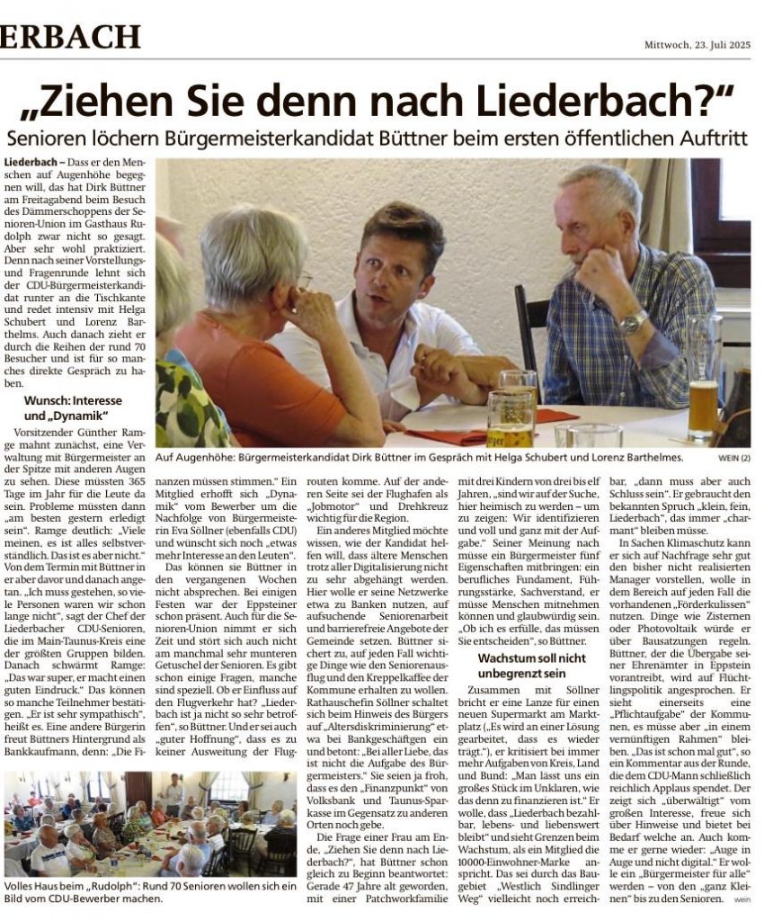 Mit einem starken Votum hat mich die CDU Liederbach in ihrer außerordentlichen Mitgliederversammlung am 23.06.2025 als Kandidaten für das Amt des Bürgermeisters nominiert.