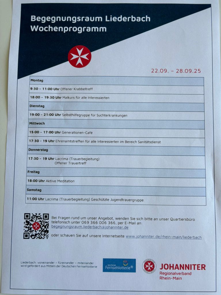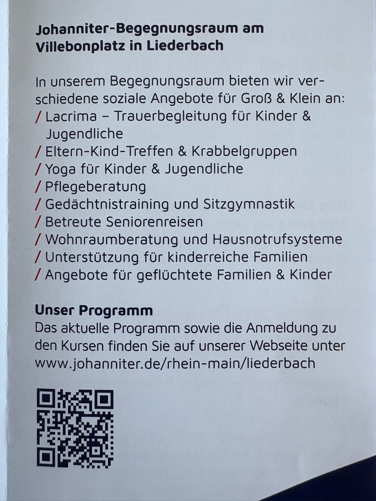 Darüber hinaus kann ich das Angebot im Begegnungsraum der Johanniter nur wärmstens empfehlen und habe das Angebot sowie den Wochenplan beigefügt. Bitte weitersagen! Ein absoluter Gewinn für Liederbach, den ich gerne nach Kräften unterstütze!